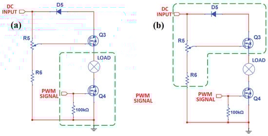 Various drive circuit devices can be controlled with an electronic switching device, such as a MOSFET, and its “on state” and “off state” are controlled by a gate-to-source voltage signal. An N-channel MOSFET can be used to turn a high-current load on and off (such as a lamp, motor, etc.) using a low-voltage, low-current control signal of a PWM generator as shown in Figure 4a []. The PWM generator used in this prototype of the power supply is a PWM 753 as seen in Figure 5. MOSFETs’ gate-to-source voltage changes according to their application and power rating. Typically, a power MOSFET needs to be fully turned on at a voltage level between 10 and 20 V []. In this design, the low-voltage control signal from the PWM is connected to the gate of the transistor Q4 with 5 V from the Arduino nano. According to the control signal, the MOSFET switches the high voltage load on, and off. The load is connected between the source of transistor Q3 and the source of transistor Q4. The transistor Q4 has a resistor R7 to prevent static charge from building between the gate junction and ground (drain) of an n-channel MOSFET, because it can absorb energy in the device capacitances [].