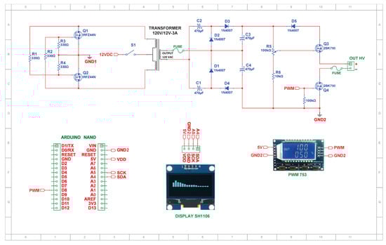 For the construction of a pulsed HVDC power supply circuit, the following electronic scheme was designed, as shown in Figure 5 showing all the components used in this prototype. The circuit was designed and simulated using electronic software (Proteus 8.6, England). The prototype was mounted in a plastic casing to avoid an electric shock. As previously described, this circuit consists of a DC/AC inverter that increases from 12 VDC to 108 VAC, a voltage quadruple circuit to convert from 108 VAC to 430 VDC, a PWM generator to control the load and a circuit to adjust the output voltage. This circuit also has two protection fuses, one at the output of the transformer (108 VAC) and another connected to the source of the power transistor Q3 responsible for adjusting the output voltage. For further security and isolation, a switch was placed on the 12 VDC power supply to prevent the transformer from working all the time and another at the high voltage output to avoid electrical shocks with the terminals in case the capacitors are still charged. The frequency and duty cycle of the load are controlled by the 753 PWM generator (No/Brand), as shown in Figure 6c.