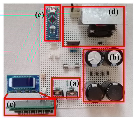 Pulsed HVDC power supply prototype. (a) DC/AC inverter, (b) voltage quadruple circuit, (c) PWM generator circuit, (d) MOSFETs gate drive circuit and dimmer circuit and (e) Arduino Nano Board.