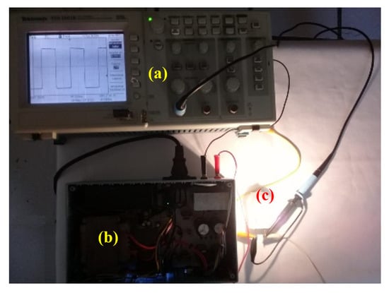 Experimental setup. (a) TDS1001B oscilloscope, (b) pulsed HVDC prototype and (c) 50 Watt lamp used as load for testing.