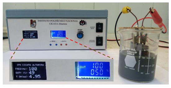 EDP pulsed with the square-shaped symmetric waveform, a potential difference of 100 VDC pulsed, frequency of 100 Hz, 50% cycle duty and 7 mm distance between electrodes, and the suspension was then deagglomerated using a high-energy ultrasonic bath for 5 minutes. Figure 9 shows the experimental setup for the preparation of SiC samples.