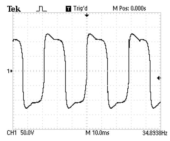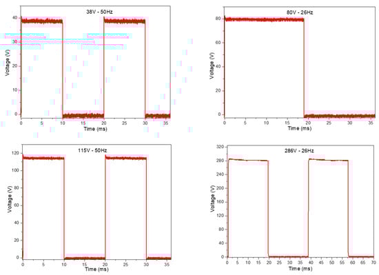 Finally, measurements were made at 26 Hz and 50 Hz with a 50% duty cycle, without load and varying the output voltage to observe the switching states of the MOSFET Q4. Figure 14 shows the waveforms without load obtained from the different switching states at different voltages. It can be noticed that the voltage signals are square waves, and when the time is HIGH, they show negligible distortion.