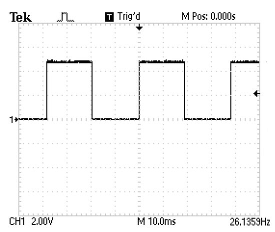 Subsequently, the signal at the output of the PWM generator was measured to observe that there are no variations in the frequency and duty cycle. To make the measurements, a frequency of 26.13 Hz and 50% duty cycle were chosen, as shown in Figure 13. The voltage of 4.8 V corresponds to the voltage supplied to the Arduino Nano board.