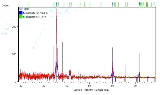 Refined XRD patterns for SiC with heat treatment at 500 °C. The blue square corresponds to 3C SiC and the green square to 6H SiC and the vertical lines are associated with the crystallographic planes of each phase.