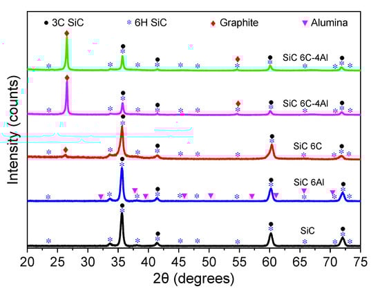 For the alumina powder, the pattern shows signals related to the η-Al2O3 with cubic structure FCC (ICSD 98-003-9104). In the case of graphite powder, the XRD pattern shows planes to a 2H hexagonal structure (ICSD 98-005-2230). Figure 17 shows the XRD patterns of the samples of SiC and SiC-Al and/or SiC-C. The diffractogram of the SiC-6C sample exhibits a small peak at an angle of 2θ = 26.27°, which corresponds to the crystallographic plane (002), but in the samples mixed with alumina, the presence of the additive and the characteristic peaks is not observed. Otherwise, the SiC Al+C samples present a higher intensity at the angle 2θ = 26.27° and a small peak at 2θ = 54.63° corresponding to graphite and a decrease in the intensity of SiC; furthermore, no peaks related to the alumina added to SiC are observed.