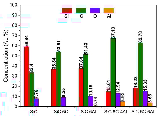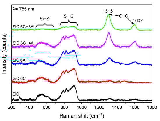 Figure 18 also shows the Raman spectra of SiC, SiC-Al and/or SiC-C. It is observed that when alumina is added to SiC, there is an increase in the intensity of the signals at 1315 cm−1 and 1607 cm−1. Therefore, the changes in the Raman spectra are caused by the addition of Al2O3. The increase in the concentration of C + Al2O3 causes a decrease in the intensity of the band in the range of 700–1000 cm−1. In addition, it is observed that the intensities of the signals at 1315 cm−1 increase with the increase in the Al2O3 content, indicating the addition of this compound [].