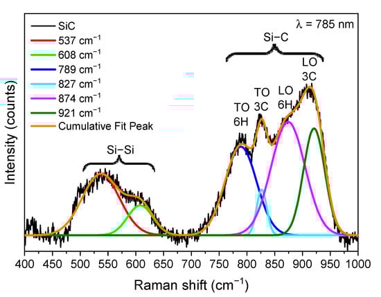 The peak at 608 cm−1 of the deconvoluted Raman spectrum in Figure 19 belongs to the Si-Si bond, this peak at higher wavenumber values and corresponds to a compression stress in these bonds; that is, they are shorter than they should be in unstressed Si−Si tetrahedra, which is the signal at 537 cm−1. SiC exhibits modes around 789 cm −1 and 874 cm−1 corresponding to the transverse (TO) and longitudinal (LO) optical Raman for 6H-SiC, respectively. Furthermore, modes at 827 cm−1 and 921 cm−1 were identified as the transverse and longitudinal optical phonons of 3C-SiC, respectively (Figure 19). The wide bands between 700 and 1000 cm−1 indicate the presence of high structural disorder in SiC bonds and are therefore attributed to the optical Raman modes of 6H-SiC []. The 1607 cm−1 signal is related to C−C vibrations in amorphous carbon []. Finally, the 1353 cm−1 signal is similar to the transverse optical Raman (TO) signal of diamond, indicating the presence of C−C sp3 bonds in 3C-SiC [].
