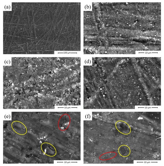 Figure 20 depicts SEM micrographs of samples compacted and heat-treated at 500 °C for 3 h. Figure 20a shows a fluted caused by the plunger after compaction, and the same phenomenon was observed in all the samples. In the compacted samples (Figure 20a–e), porosity and fractures are observed, possibly due to the low treatment temperature. On the other hand, in Figure 20e,f graphite crystals with particle sizes smaller than <10 μm can be observed.