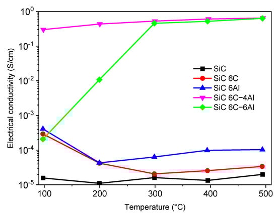 Figure 23 shows the electrical conductivity (σ) as a function of the measured temperature of the SiC samples mixed with alumina and/or graphite and for the SiC sample heat treated at 500 °C. As seen in Figure 23, electrical conductivity of the SiC sample does not show a significant change. The SiC-6C sample decreases the electrical conductivity showing a metallic behaviour [] from 100° to 300 °C and then increases the electrical conductivity from 300 to 500 °C showing a semiconductor behaviour [], and a similar case occurs with the SiC 6Al sample, whereas the σ of the SiC 6C-4Al sample increases monotonically with an increasing temperature until reaching 500 °C and achieving σ = 0.65 S/cm. On the other hand, the SiC 6C-6Al sample shows a semiconducting behaviour from 100 to 300 °C obtaining a σ = 0.45 S/cm to then grows monotonically from 300 to 500 °C showing a metallic behaviour in that temperature range. For the samples without additive and mixed only with alumina or graphite, the electrical conductivity is low with respect to the samples added with C + Al2O3, which show a result of four orders of magnitude higher than the aforementioned samples in the range of 300 to 500 °C. The slight increase in electrical conductivity in the SiC 6C-4Al and SiC 6C-6Al samples may be due to the help in the sintering process provided by the alumina during heat treatment and to the conductive property of graphite.