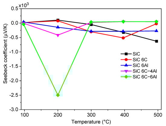 Figure 24 shows the Seebeck coefficient (S) as a function of temperature for the samples of SiC mixed with alumina and/or graphite and for the sample additive-free. The samples showed an n-type semiconductor behaviour. The Seebeck coefficients of the samples showed distributed values in all the temperature ranges; for example, the Seebeck coefficient of the SiC additive-free increased with an increasing temperature, obtaining values of 15 to −630 μV/K. This maximum value is equal to or greater than that reported by Masuda et al. in the temperature range of 400~500 °C with a Seebeck coefficient ≈ −600 μV/K []. The highest Seebeck coefficient was measured for the SiC 6C-4Al sample and was observed at 200 °C to be roughly −2500 μV/K due to a strain-induced redistribution of the effect states caused by interface mismatch, as informed by Cramer et al. [], obtaining high Seebeck coefficients for their Si/SiC multilayer thin-film systems and reported values of −2600 μV/K at 870 K.