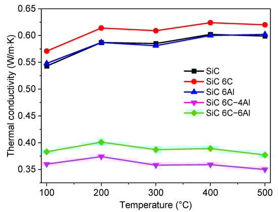 Figure 25 shows that the thermal conductivity (κ)of the SiC, SiC 6C and SiC 6Al samples tended to increase with an increasing temperature due to the metallic behaviour of the material [], while in the SiC 6C-4Al and SiC 6C-6Al samples, the thermal conductivity tended to decrease with an increasing temperature due to Umklapp phonon dispersion [], obtaining values of 0.35 W/m·K and 0.377 W/m·K at 500 °C, respectively.
