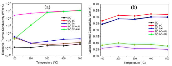 Figure 26 show the temperature-dependent electronic and lattice contributions to the thermal conductivity of the SiC and SiC added with alumina and/or graphite samples. It was observed that the electronic κE increases slightly due to the metallic nature of the material []. The κL also decreases despite the slight increase in κE of the SiC 6C-4Al and SiC 6C-6Al samples, which decreases the total thermal conductivity of the samples.