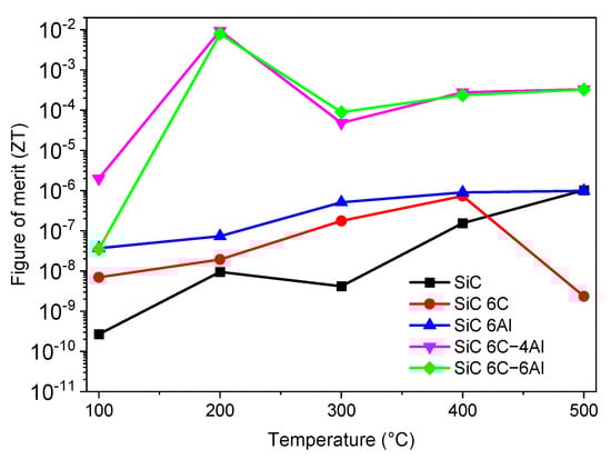 A maximum ZT value of ≈0.01 was obtained with an addition of 6 wt.% C and 4 wt.% Al2O3 at 200 °C, which corresponds to an increase of ≈ 200% with respect to that reported by Cagri et al. Although the ZT values achieved in this study were smaller than typical TE materials, such as BiTe-based alloys, and even high-temperature materials, such as HH and SiGe alloys, these materials generally decompose, melt or oxidize at temperatures above 1000 °C []. Since the ZT values of SiC with graphite and/or increase with an increasing temperature, this material appears to have high potential for high-temperature TE applications [].