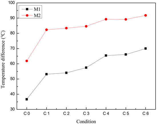 When M2 is placed on the surface of the high-temperature exhaust heat exchanger channel, the lower thermal conductivity prevents heat from rapidly conducting to the cold end of the thermoelectric module on the outer side. In contrast, the higher thermal conductivity of M1 allows heat to conduct more quickly to the cold end of the module, where it is carried away by the cooling water, resulting in a lower temperature at the hot end and a higher temperature at the cold end, thus reducing the temperature difference between the hot and cold ends, as shown in