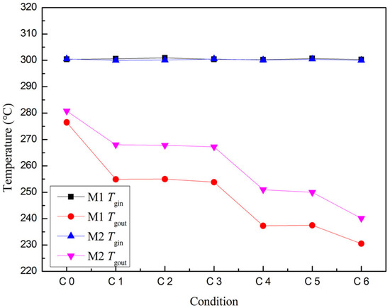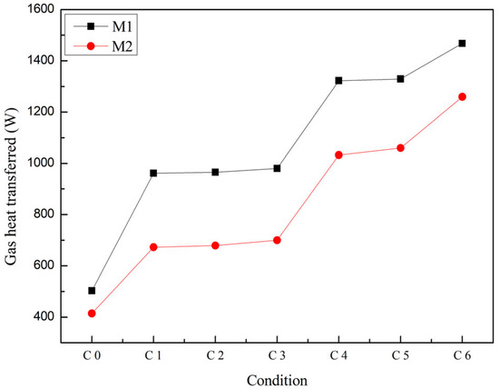 When the gas inlet temperature remains constant, the lower thermal conductivity of M2 results in it playing a certain role in insulation on the surface of the heat exchanger channel. Therefore, when the high-temperature gas passes through the heat exchanger channel of the thermoelectric generator using M2, the heat of the gas is not easily carried away by the outer cooling water, resulting in less heat loss. Consequently, the gas outlet temperature is higher compared to that of the thermoelectric generator using M1. This difference in inlet and outlet temperatures directly affects the effectiveness of heat transfer within the channel. A larger temperature difference implies greater heat transfer. Therefore, the heat transfer within the high-temperature exhaust heat exchanger channel using the M2 thermoelectric generator is relatively small, as shown in