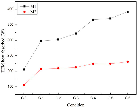 Figure 8, when using the high-performance M2, the exergy heat absorbed by the thermoelectric generator is smaller than that of using the low-performance M1. This is because M2 has a lower thermal conductivity compared to M1. The lower thermal conductivity means that M2 encounters greater resistance when transferring heat, resulting in a slower conduction of heat within the material. Therefore, even though the temperature at the hot end of M2 may be higher, the exergy heat absorbed is limited and reduced because heat cannot effectively conduct to the cold end of the thermoelectric module. The exergy heat absorbed refers to the usable energy absorbed by the thermoelectric generator, which is exergy. In the thermoelectric generator, the temperature difference is one of the key factors in producing the thermoelectric effect. In the Seebeck effect, the larger the temperature difference, the greater the voltage difference within the thermoelectric module. According to the Seebeck effect, voltage is proportional to the temperature difference, and a larger temperature difference results in the generation of more electrical energy within the thermoelectric module. The TEM heat absorbed represents the total heat absorbed by the thermoelectric generator. Even though the high-performance M2 has a larger temperature difference, if it absorbs relatively less heat, the exergy heat absorbed will correspondingly decrease. Additionally, as shown in the figure, with the increase in the thickness and PPI of the metal copper foam, the exergy heat absorbed by the thermoelectric generator also increases. This is because increasing the thickness and PPI significantly enhances the absorption of heat from the high-temperature gas within the heat exchanger channel by the thermoelectric module.