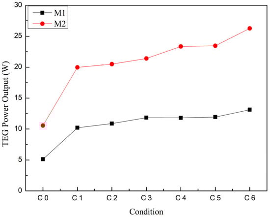 Figure 6 are as follows: (1) The high-performance M2 has a higher Seebeck coefficient, which means it can more effectively convert the temperature difference into electrical energy. Therefore, M2 can generate more electrical energy output under the same temperature difference. (2) The thermal conductivity of M2 is lower than that of M1. A lower thermal conductivity means that heat transfer within M2 is slower. Therefore, at a constant inlet temperature, M2 can more fully utilize the heat to generate more electrical energy output. (3) As shown in