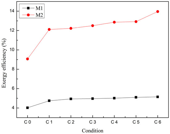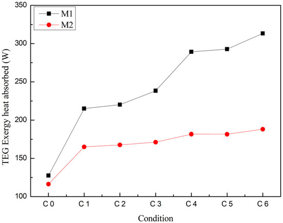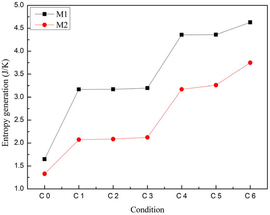 Figure 10. This is because M2 exhibits a superior performance, making the thermoelectric conversion process more efficient and reducing irreversible processes within the system. Firstly, the high efficiency of M2 means that more thermal energy is converted into electrical energy rather than being wasted, thereby reducing unnecessary thermal energy losses. Secondly, due to the lower thermal conductivity of M2, heat transfer within the system is more efficient, reducing the heat losses. These characteristics collectively result in a reduction in irreversible processes within the system when using M2, thereby decreasing the generation of entropy. In terms of waste heat recovery, higher entropy generation may imply an exacerbation of the system impact on the environment, as an increase in entropy indicates a greater irreversibility within the system, leading to more difficult recovery of heat energy that may be lost to the environment. Therefore, by optimizing the design of thermoelectric generators to reduce entropy generation, the efficiency and performance of waste heat recovery systems can be improved, reducing energy waste and achieving more effective energy utilization.