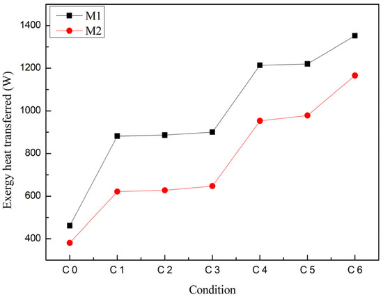 Exergy heat transferred represents the effective energy transferred during the energy transfer process of the thermoelectric generator. Equation (8) indicates that exergy heat transferred is influenced by two factors: gas heat transferred and entropy generation. Gas heat transferred refers to the thermal energy transmitted through the thermoelectric generator, while entropy generation represents the entropy generated in the system due to irreversible processes. When using M2, it is expected that the irreversible processes in the system will be relatively reduced because high-performance thermoelectric materials typically have a higher efficiency and lower thermal conductivity. This performance advantage effectively reduces irreversible processes such as heat losses and thermal resistances in the system, thereby reducing the generation of entropy. In contrast, the use of the low-performance M1 may lead to more irreversible processes, thereby increasing the value of entropy generation. Therefore, due to the relatively fewer irreversible processes in the system under M2, the entropy generation is lower, and the gas heat transferred using M1 is higher than M2, resulting in the exergy heat transferred of the thermoelectric generator being smaller when using M2 compared to M1, as shown in