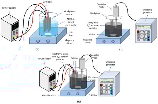 Schematic of experiment setup for (a) electropolishing, (b) surface finishing with ultrasound and abrasion, and (c) ultrasound abrasive-driven electrochemical hybrid finishing.