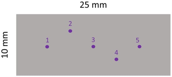For both as-built samples and finished samples, surface images were taken and surface roughness values were measured using a 3D laser scanning confocal microscope (VK-X250, Keyence, Osaka, Japan). To characterize both the surface roughness and the surface waviness in the following section, five positions were measured for each coupon as shown in Figure 2 and the average and standard deviation of the five values were calculated to present the results. ISO 25178 [] was followed when characterizing the surface roughness. A laser beam scans the xy plane of the sample surface, while the accumulation of reflection information along the z-axis constitutes the confocal image for roughness measurement. In order to investigate the average surface roughness change of the printed samples, the arithmetical mean height (Sa) was measured and compared in this research. Surface defects and irregularities which result in different levels of surface roughness before surface finishing were also characterized with a scanning electron microscope (SEM) (VEGA3, TESCAN GROUP, Brno, Czech Republic).