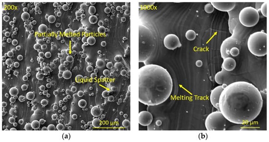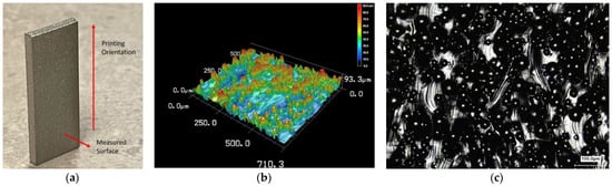 Figure 3a shows the photo of the as-built coupon printed vertically with reference to the building plate. Figure 3b,c show the 3D height profile and laser optical image of the as-built surface. The average initial surface roughness of the as-built vertical surfaces in this batch is 11.50 ± 0.81 μm. The high surface roughness for the as-built surface was caused by different types of surface defects and surface irregularities, as shown in the SEM images in Figure 4. Partially melted particles are the primary cause of high surface roughness, as unmelted metal powders adhere to the surface at extremely high temperatures [], with a larger attaching tendency for finer particles []. A balling effect as well as the formation of liquid spatter also contribute to the high surface roughness, resulting from the tendency of the melt pool track to minimize its surface energy due to liquid surface tension []. Apart from these, surface cracks and solidified melting tracks also lead to the increase in surface roughness.