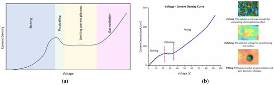 Before conducting the electropolishing experiment, a current density–voltage curve was obtained to find the optimal working range of the material system. The concept of the current density–voltage curve was proposed by Jacquet [], as shown in Figure 5a []. There are four regions involved in the electropolishing process resulting from voltage differences, including etching, passivating, polishing, and gas evolution. Under a low-voltage regime, the anodic dissolution rate is slower than the rate of mass transfer; etching instead of polishing happens, where the workpiece surface is directly dissolved rather than achieving the smoothening effect. In this region, current density increases with voltage proportionally. The anodic dissolution rate keeps increasing with the increase in voltage, and when the dissolution rate exceeds the mass transfer rate, a passive oxide layer forms on the metal surface, leading to a slight decrease in the current density due to its larger resistivity compared with metal substrates. Since this region happens in a narrow voltage range, it may not easily show on the measured curve. In addition, when the anodic dissolution rate is higher, the reaction enters the mass-limited stage, where the current density remains constant with the voltage increases, and polishing happens in this stage called the limiting current plateau region. After that, increasing the voltage further will cause the breakdown of the passive oxide layer, resulting in the oxygen evolution at the anodic workpiece, leading to the rapid increase in current density and the formation of pitting corrosion on the metal surface.