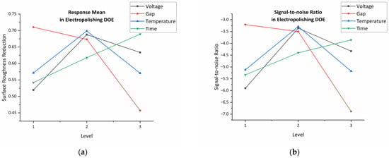 Main effect plots in electropolishing DOE for (a) response means and (b) S/N ratios.