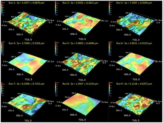 The Taguchi orthogonal array listed in Table 1 was analyzed based on the mean value for the surface roughness reduction and signal-to-noise ratio, as shown in Figure 6a,b. According to the results, in the three-level Taguchi design, when the voltage is 30 V, the temperature is 40 °C, the inter-electrode gap is 5 mm, and the polishing time is 45 min, the largest S/N ratio and the largest mean for surface roughness reduction can be achieved. Therefore, these parameters were selected to conduct further hybrid treatment. Figure 7 presents 3D surface images achieved by a Keyence laser profilometer after nine treatments.