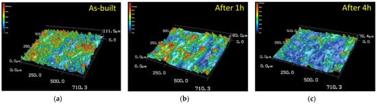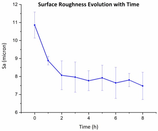 In order to study the combined effect of ultrasonic vibration and abrasion on the surface roughness reduction, a surface roughness evolution curve was obtained after conducting the sole process for 8 h, as shown in Figure 8. The figure shows that the surface roughness of the part decreases rapidly in the first two hours and then becomes relatively stable afterward. Figure 9 presents and compares 3D images of the as-built part surface (Figure 9a) and the surface after 1 h (Figure 9b) and 4 h (Figure 9c) of treatment. While some partially melted powders can be removed from the metal surface, only 27% of surface roughness reduction was achieved. Due to the fact that no satisfying result was achieved from this method during the screening phase, no complete DOE was designed and conducted for this process. According to the preliminary results, ultrasound and abrasion alone do not have the capability to effectively reduce the surface roughness of the AM metal parts. However, when combining these with electrochemical surface finishing, synergistic effects are induced, improving the surface quality and the process efficiency at the same time.