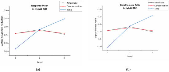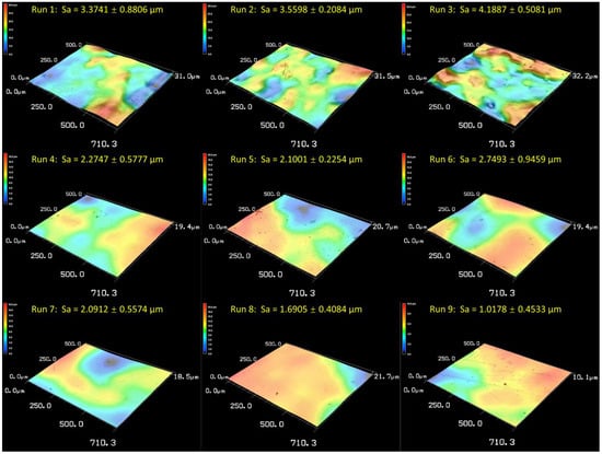 Figure 10a,b show the main effect plots for response means and for S/N ratios when analyzing the surface roughness for the hybrid DOE as shown in Table 2. According to the results, in the three-level Taguchi design, when the process time is 45 min, the ultrasonic amplitude is 80%, and the abrasive concentration is 10%, the largest S/N ratio and the largest mean for surface roughness reduction can be achieved. However, the influence of ultrasonic amplitude and abrasive concentration is less significant than processing time in the selected parameter range. Figure 11 presents 3D surface images achieved by a Keyence laser profilometer after nine treatments.