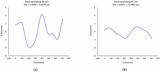 To analyze surface waviness, a waviness filter was applied to the line profile to extract large-scale surface waviness while eliminating the small-scale roughness signal. Figure 12 shows surface waviness profiles after electropolishing and hybrid finishing under optimal working parameters for different processing times as shown in Table 3. Increasing the finishing time from 30 min to 45 min for electropolishing and hybrid finishing decreases the surface waviness by 66.5% and 47.4%, respectively. Compared with electropolishing, hybrid finishing has the capability to provide a surface with a similar surface waviness in a shorter time, with the average Wa value of 0.83 μm after electropolishing for 45 min, while the same value is 0.94 μm after hybrid finishing for 30 min. After process optimization for both processes, although similar Sa values are obtained, the surface waviness of hybrid technique-treated samples is much less than the electropolished samples, as presented in Figure 13.
