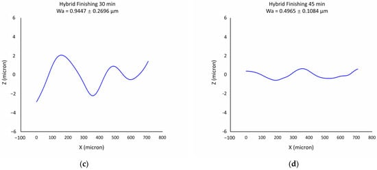 Surface waviness profile for (a) electropolishing for 30 min; (b) electropolishing for 45 min; (c) hybrid finishing for 30 min; (d) hybrid finishing for 45 min.