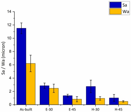 Similar to electrochemical polishing, processing time is an important influencing factor for the hybrid finishing process. If the finishing time is too short, it is not adequate to generate effective polishing footprints on the part surface. The results show that hybrid finishing is able to decrease the Sa value of the part surface to ~1.02 μm after 45 min. Both ultrasonic amplitude and abrasive concentration have a slight impact on the Sa reduction. If the ultrasonic amplitude is not high enough, the vibration might not be substantially large for accelerating abrasive particles in the slurry, resulting in a low material removal efficiency. In addition, it is challenging for low-amplitude ultrasound waves to provide enough power to ensure uniform ionic mass transport for electrochemical polishing. However, a high ultrasonic amplitude may generate a huge amount of localized heat, causing damage to the metal surface while making it difficult to control the electrolyte temperature. If the abrasive concentration in the slurry is too low, the lack of abrasive particles in the slurry might not initiate obvious abrasion and peening on the surface for changing the surface condition. However, if the concentration is too high, abrasive particles could be embedded in the part surface, which might lead to a further increase in surface roughness. Meanwhile, the addition of abrasive particles in the electrolyte slurry also increases its viscosity while decreasing its conductivity [,], leading to the deterioration in the electropolishing performance.