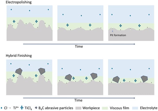 In the electropolishing process, a voltage is applied between the workpiece anode and the inert cathode; Ti atoms on the workpiece surface dissolve in the electrolyte by being oxidized to Ti4+ ions. In order to maintain the electrical neutrality of the electrolyte, Cl− ions in the bulk electrolyte migrate to the workpiece surface and complex with Ti4+ to form TiCl4. TiCl4 is a viscous liquid, which forms a viscous layer with a higher electrical resistivity compared to the bulk electrolyte adjacent to the workpiece anode. According to the viscous film theory [], due to the high surface roughness of the as-built workpiece, the thickness of the viscous layer at the valley is higher than the thickness at the peak. Accordingly, the viscous layer at the valley has larger electrical resistance compared with the viscous layer at the peak, resulting in a potential difference at different surface locations, leading to a leveling and polishing effect. With the progress of the aforementioned process, the surface roughness as well as the surface waviness decreases with time, while the uniformity of the waviness distribution also increases. Although electropolishing has the capability to reduce the surface roughness and waviness, when the processing time reaches the threshold limit, instead of polishing the surface and further reducing the surface waviness, overpolishing occurs with pits forming on the surface. The mechanism is shown in Figure 14.