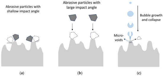Mechanism for roughness removal due to ultrasound and abrasion: (a) cutting due to shallow impact angle; (b) peening due to large impact angle; (c) micro-void formation and material removal due to cavitation bubble collapse.