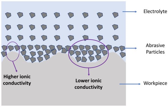 In addition to the aforementioned mechanisms for reducing surface roughness, we propose another possible mechanism for the hybrid finishing technique to mitigate surface waviness, attributed to the synergistic effect of electropolishing, ultrasound, and abrasives. Given that solid surfaces in the liquid electrolyte solution are the preferred sites for cavitation to occur, the localized bubble density near the metal surface may be higher than in other areas of the bulk electrolyte during treatment. Moreover, bubbles and abrasives situated at the wave trough are less likely to move freely, potentially resulting in higher concentrations of abrasive particles and cavitation bubbles at the metal surface compared to the bulk electrolyte, as shown in Figure 16. The presence of a higher concentration of particles at the wave trough increases the viscosity in this region, maybe leading to a decrease in ionic conductivity compared to the wave crest. Consequently, the application of ultrasound and abrasive particles may generate a “synthetic viscous layer” at the metal surface on a larger scale, adjusting the localized ionic conductivity of the electrolyte during the electropolishing process and thus reducing surface waviness.
