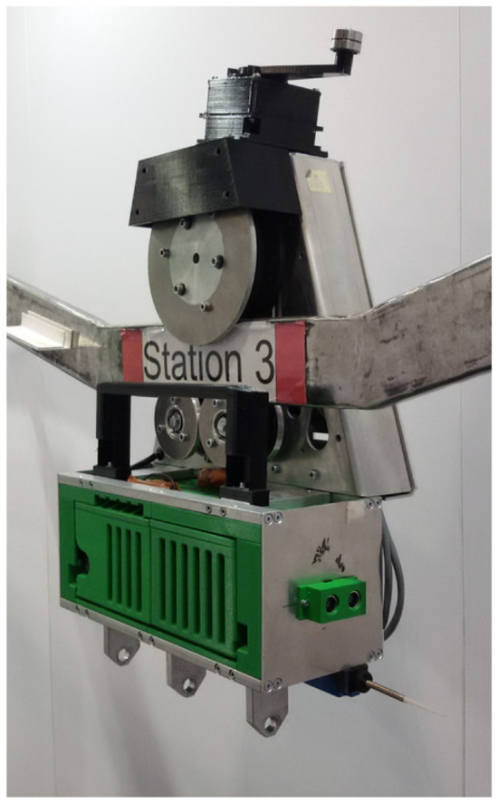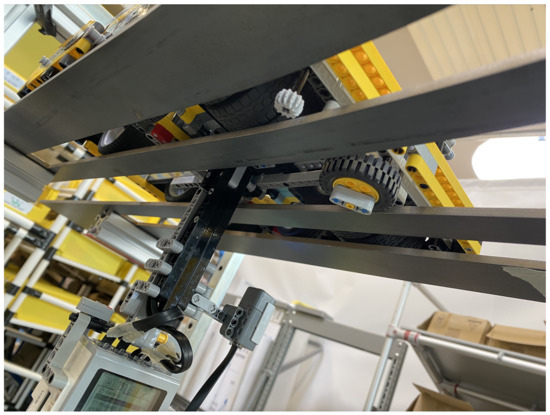 Regarding scientific publications, ref. [12,13] showed two further ultralight EMS concepts for the transport of goods up to over long distances. The system described in [13] includes a battery-powered trolley (cf. Figure 3) for bridging long transport distances in intralogistics environments or for placing sensors in hard-to-reach areas. The trolley runs on various support structures, such as rectangular profiles, flat profiles, and steel cables. Semi-passive turnout elements without actuators, sensors, or controllers are used. Figure 4 shows the battery-powered trolley with a load of on a rectangular profile rail. Figure 3 shows that gradients of can be implemented.