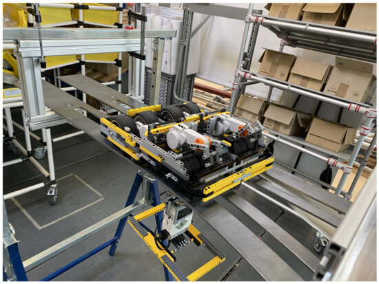 The test trolley (cf. Figure 8) was built with Lego® Technic and consists of two motors for bidirectional movement and two further motors that act as the actuators for the support wheels for turnout functionality. For the experimental setup, a color sensor was used to detect the end of each of the lanes (cf. Positions (A), (B), and (C) in Figure 9). The motors and the color sensor were controlled using a Lego® Technic EV3 and powered by the integrated battery. The state machine used to control the trolley and carry out the experiments was programmed in Python.
