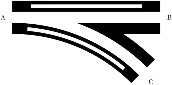 For turnout functionality, grooves in the outer running rails within the turnout track element are required. Figure 6 shows a turnout element with a branch to the right and the two grooves. However, tests have shown that a branching groove is only necessary for the branches deviating from straight-ahead movement (cf. Section 4). It can seen that the grooves for directional guidance are designed much more narrowly than the gap in the center of the rail.