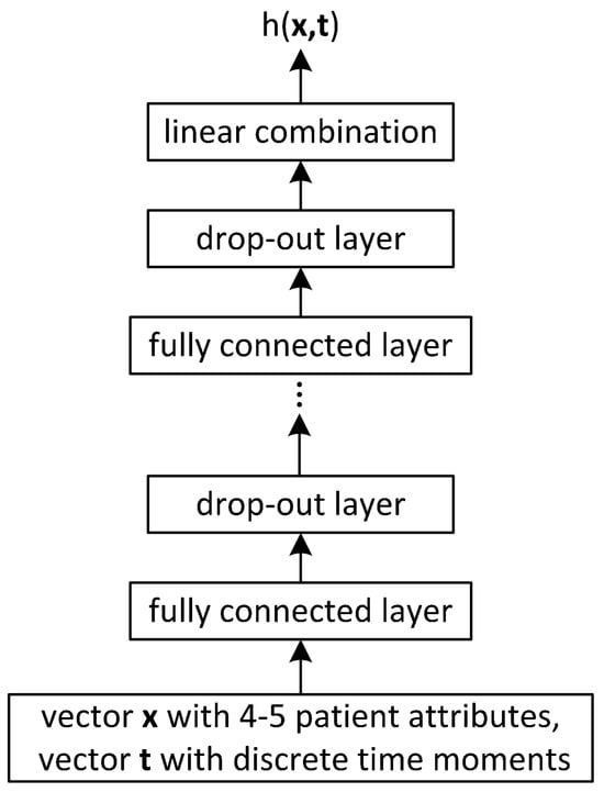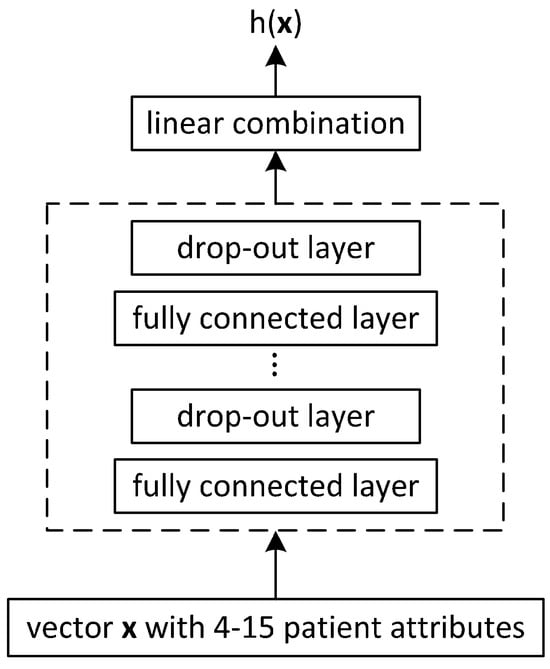 As far as DL is concerned, in the context of modern hardware and flexible software frameworks, the research community revisited the idea of Faraggi–Simon [3] to approximate the effects of patient’s covariates on their hazard rate directly with a NN, which looked promising since a potentially limiting assumption of the Cox model would be relaxed; while, as discussed in [8], the model assumes that a patient’s log-rank risk is a linear combination of the covariates, it may be oversimplistic to assume that the log-risk function is linear, and instead, genes (gene expressions are modeled as covariates) can engage in higher-order interactions. Neural networks can handle these non-linear relationships and higher-order interactions among the features. To this end, the from Equation (1) can be substituted with a NN that takes X as an input and outputs .