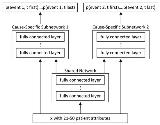 DeepHit [15] was designed for few (21–50) clinicopathological attributes and big datasets: the United Network for Organ Sharing with 60,400 patients (UNOS) the Molecular Taxonomy of Breast Cancer International Consortium, the Molecular Taxonomy of Breast Cancer 1.9 K patients (METABRIC), and the Surveillance, Epidemiology and End Results Program (SEER) with 72.8 K patients [27]. The architecture (Figure 3) implements a multi-task network which consists of a shared subnetwork and K-specific subnetworks. The output layer implements the softmax in order to obtain the joint distribution of the competing events. Also, there is a residual connection from the input covariates to the upper layers, in this case to the input of each cause-specific subnetwork. The main motivation is to model competing risks, for example, such as cardiovascular comorbidities during cancer treatment.