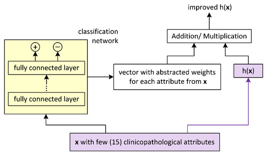 DeepCoxPH [14] takes 15 clinicopathological attributes as an input. It was tested on the Breast Cancer Consortium database [28] with 229 cases and 229 controls: 10-year survival in breast cancer. The hazard ratios from CoxPH and the weights from a deep learning fully connected classification network were combined via matrix multiplication/addition (Figure 4). The fully connected feed-forward NN for a binary classification with the optimal hyperparameters was identified via a grid search.