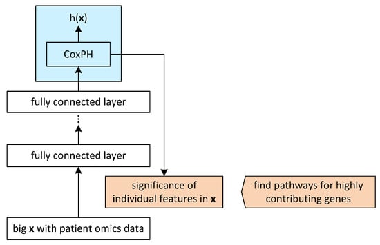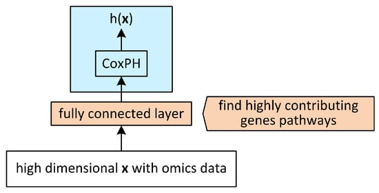 Cox–nnet [13] was developed for high throughput transcriptomics data and tested on 10 datasets, those containing at least 50 deaths, from The Cancer Genome Atlas (TCGA) [29]. The testing was performed alongside the algorithms from the main survival families: regression, forest, and boosting. The output of the NN with a single hidden layer enters the Cox regression model as an input (Figure 5). The set of hyperparameters was found via experimentation in 10-f cv. The method is biologically interpretable in the sense that input genes with high weights to the input nodes can be further analyzed with the methods designed to interpret gene function [30], such as the GO and KEGG.