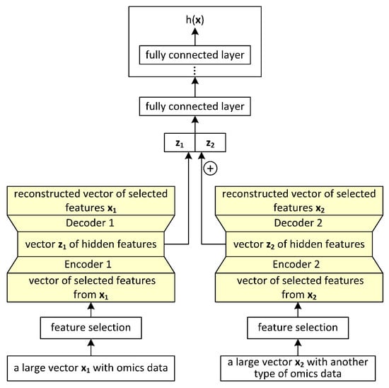 Concatenation autoencoders [19]: takes multi-omics data proven from breast cancer data from TCGA with 1060 patients and includes (1) gene expression, (2) miRNA expression, (3) DNA methylation, and (4) copy number variations. The number of attributes is made smaller via a supervised feature selection (Figure 6). The output of the fully connected neural network replaces the initial feature vector. Further, the fusion of different modalities is performed via a “concatenation autoencoder”, i.e., concatenating the hidden features learned from each modality, in this way benefiting from the idea that each modality brings unique information, emphasizing the complementarity principle. The idea of a cross-modality autoencoder is also considered (emphasizing agreement and achieving modality-invariant representation), but it is lower performing compared to the concatenation idea.
