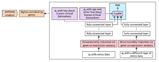 VAE-Cox [12] takes the transcriptomics data from 20 datasets of TCGA. The problem of p >> n is addressed via pretraining, namely, the low level weights are learned from other datasets. The optimal architecture is found via experimentation. The initialization weights are taken from the encoder model, which learns to map genes to genes. The third hidden unit is the input to the hazard ratio calculation. The contribution of the individual gene expressions to the disease is interpreted via the gene ontology analysis (KEGG): one layer learns disease-specific information and reveals pathways in cancer, and the other one is biologically basic and relates to metabolism only. The architecture is depicted in Figure 10. This is not used in clinical studies at the moment of the manuscript preparation.