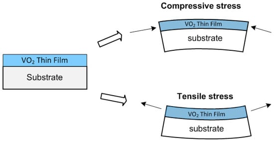 Optical thin films have been applied in various optical components; in particular, the stability of optical thin film filters in the environment is particularly important [1]. When optical thin films are used in solar panels, optical communications, displays, lasers, optical detectors, and sensors in the visible and infrared spectra, the operating temperature range of these components will vary with changes in environmental temperature. As the temperature of the optical thin film rises, it will be affected by thermal stress, causing changes in the optical thickness or refractive index of the optical thin films and resulting in a drift in the center wavelength with temperature changes [2]. Vanadium dioxide (VO2) has garnered widespread attention due to its unique insulator-to-metal phase transition characteristics. With temperature variations, VO2 undergoes a reversible transition between insulating and metallic states, leading to significant changes in its electrical and optical properties [3]. The metal-to-insulator phase transition (MIT) behavior in VO2 was first reported by Morin in 1959 [4]. In some study cases, vanadium dioxide (VO2) exhibits a thermally induced structural phase transition from a monoclinic (M1) to rutile tetragonal (R) structure at 68 °C under no strain. In fact, thermal stress in thin films is complexly affected by multiple parameters, including the coefficient of thermal expansion (CTE), substrate properties, film thickness, and thermal conductivity. These factors collectively influence the overall thermal stress experienced by the thin film system [5,6]. Residual stress is a major challenge that can induce functional defects, often resulting in significant changes in shape and structural integrity. These effects may manifest as lamination, buckling, or even the formation of cracks. In 2012, Tsai and Chin et al. [7] discovered a relationship between the residual stress of VO2 film deposition and the phase transition temperature (Tt). Residual stress was quantitatively measured by X-ray diffraction. It has been verified that the reduction in the phase transition of polycrystalline VO2 films with (011) orientation is due to shrinkage caused by residual tensile stress. The degree of crystallization of the VO2 film will change the residual stress in the deposited state. In 2014, Sakai et al. [8] reported that substrates with larger thermal expansion coefficients cause larger out-of-plane lattice spacings in both Pt and VO2 and lower transition temperatures for VO2 films.