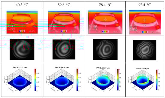 Thermal images, interference fringes, and 3D surface profile of the VO2 film coated on the B270 glass substrate at different heating temperatures.