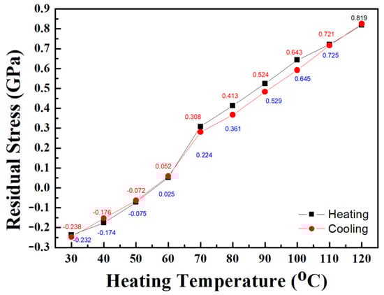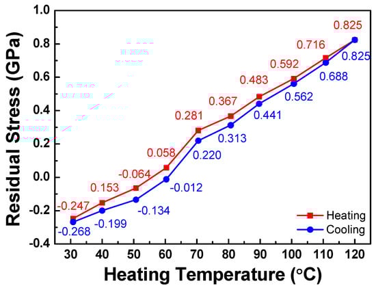 As the temperature rises from ambient temperature to 120 °C, the average residual stress significantly increases. The increase in temperature causes the residual stress of the VO2 thin film deposited on the B270 and H-9KL glass substrates to shift towards a more tensile state. The coefficient of thermal expansion (CTE) of the VO2 thin films can be determined by analyzing the stress–temperature relationship using the double substrate method, which takes into account factors such as the substrates’ properties, film thickness, and temperature variations. The residual stress variation of the VO2 film coated on the B270 and H-9KL glass substrates during heating is approximately linear.