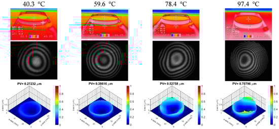 Figure 5 shows the NIR thermal images, the interference fringes, and the 3D surface profile of the VO2 thin film deposited on the H-K9L glass substrate, which were examined at various heating temperatures. The measurement results show that the number of interference fringes gradually increases with increasing temperature. The changes in the 3D profile also show that as the heating temperature increases, the film’s surface profile changes from slightly concave to more concave, which means the radius of curvature changes from a large value to a smaller value. Figure 6 illustrates the residual stress in the VO2 thin film deposited on H-K9L glass substrates plotted against temperature. The plot shows the measured average stress (open circles) data versus heating temperature. When examining the impact of temperature on the average residual stress, we assess changes in substrate curvature before and after film deposition in all radial directions. As the temperature increases, the film stress values fluctuate within the range of −0.247 to 0.825 GPa. The residual stress changes from compressive stress to tensile stress in the heating process. We found a linear correlation between residual stress and heating temperature. As the temperature rises from room temperature to 120 °C, the residual stress in the VO2/H-K9L sample transitions from compressive to tensile stress. Both samples display a rise in residual stress with increasing heating temperatures, depicting the stress function of VO2 films on various substrates in response to temperature changes. Through curve fitting in Figure 6, we determined that the slope of the stress–temperature plot for the VO2/H-K9L sample is 3.2 × 10−3 GPa/°C. It should be noted that a significant stress alteration in the VO2 thin film coated on the H-K9L glass occurs when the temperature exceeds 60 °C. As the temperature rises, a transition from compressive to tensile stress in the VO2 film can be observed.